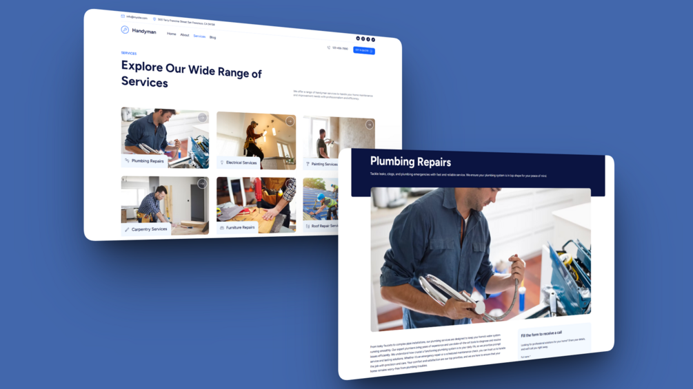 Designed for professional handymen, repair specialists, and home improvement businesses, the Handyman template provides a sleek, minimalistic, and highly functional layout. With a user-friendly structure and intuitive navigation, this template ensures that businesses can showcase their expertise while maintaining a professional and approachable online presence.
